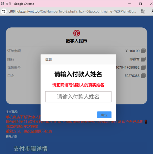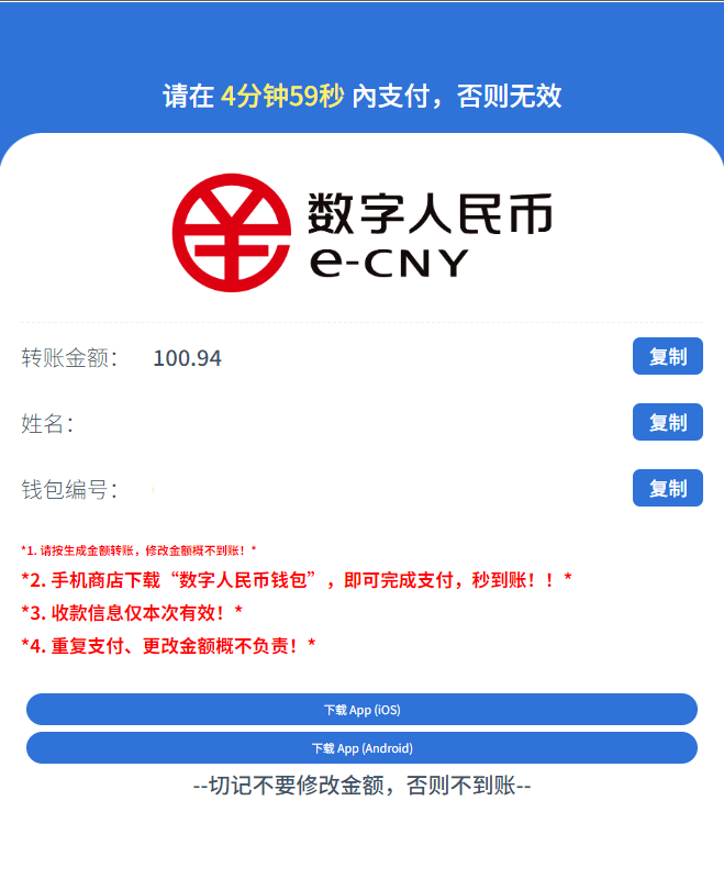 - Input payer name and and copy the Wallet Code then open the Digital Yuan App.