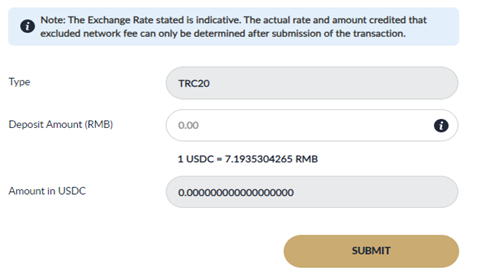 - You will be redirected to Crypto currency page. This page will show you the Address and Crypto amount (USDC) that you need to transfer excluding transaction fee (gas fee or miners fee). Note: The exchange rate stated is indicative. The actual rate and amount credited can only be determined after submission of the transaction.