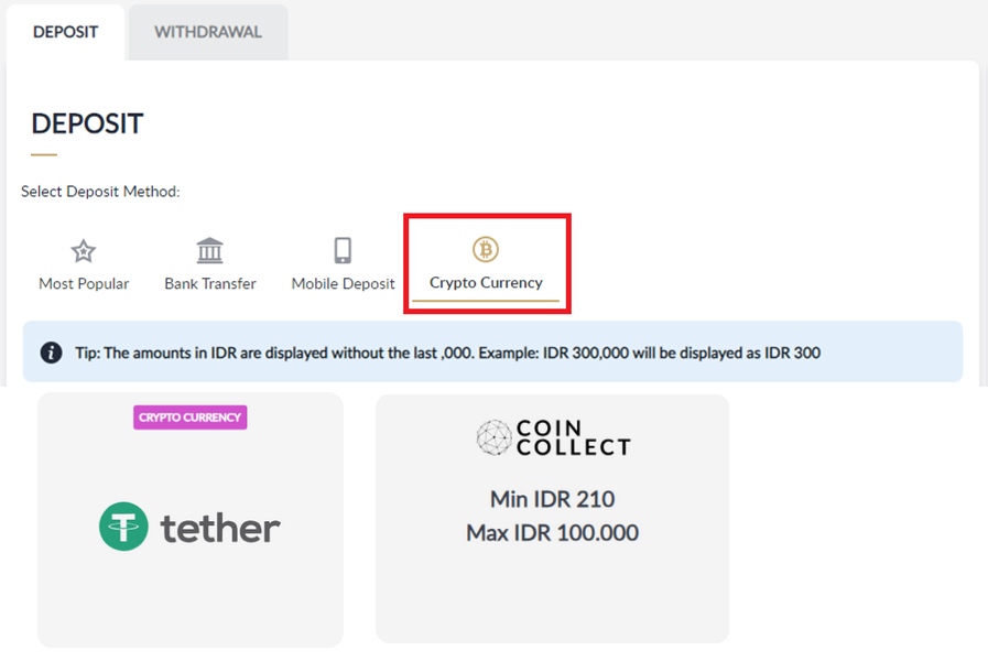 - Click "DEPOSIT" tab → Click "CRYPTO CURRENCY" → Click "TETHER" → Click "COIN COLLECT".