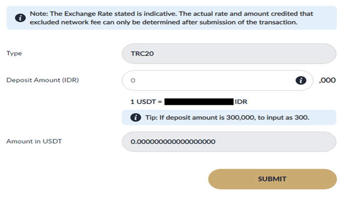 - Input the deposit amount → Choose preferred bank → Click "SUBMIT".