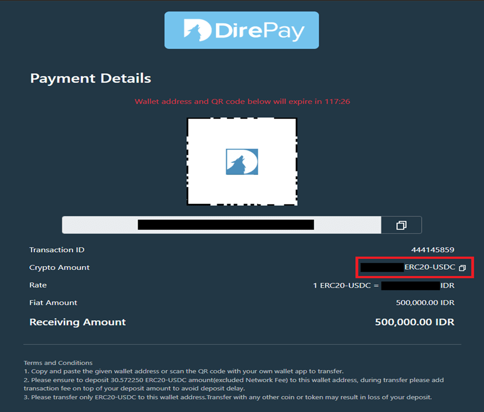 - Click "DEPOSIT" tab → Click "CRYPTO CURRENCY" → Click "USD COIN" → Choose "DIREPAY".