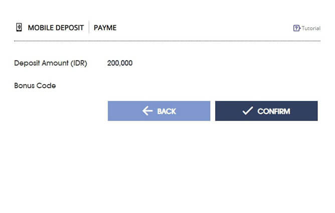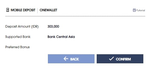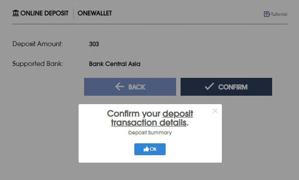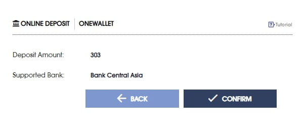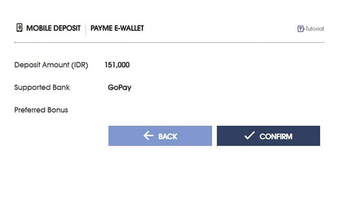 - Click CONFIRM to be re-directed to a new page or click BACK to modify your deposit amount and preferred E-wallet option.