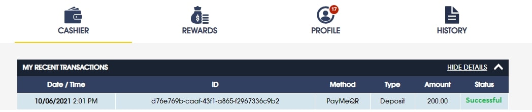 - Find your latest deposit record in "MY RECENT TRANSACTIONS" once your deposit has been credited successfully.