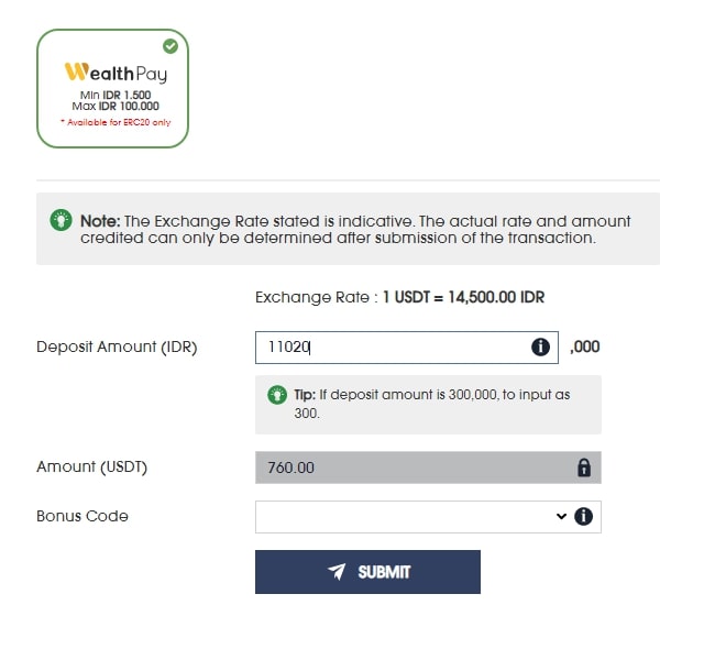 - Choose WealthPay, Input Deposit Amount and click submit.