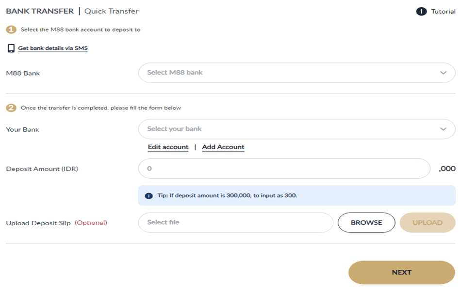 - Choose "M88 BANK" → Choose "YOUR BANK" → Input the deposit amount → Click "NEXT".