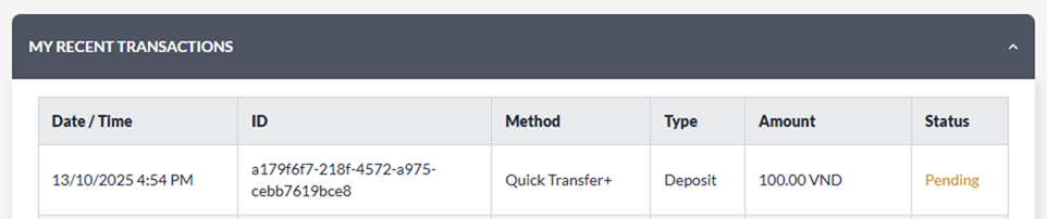 - Please transfer to the listed account, and make sure the amount you send matches the unique amount to ensure your deposit is processed smoothly.