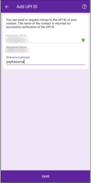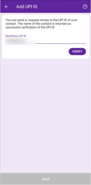 Insert the UPI address from step 3 and click VERIFY. Save the UPI Account by clicking SAVE