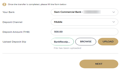- Once the transfer is completed, kindly submit the deposit form and click "NEXT"