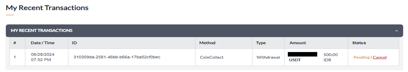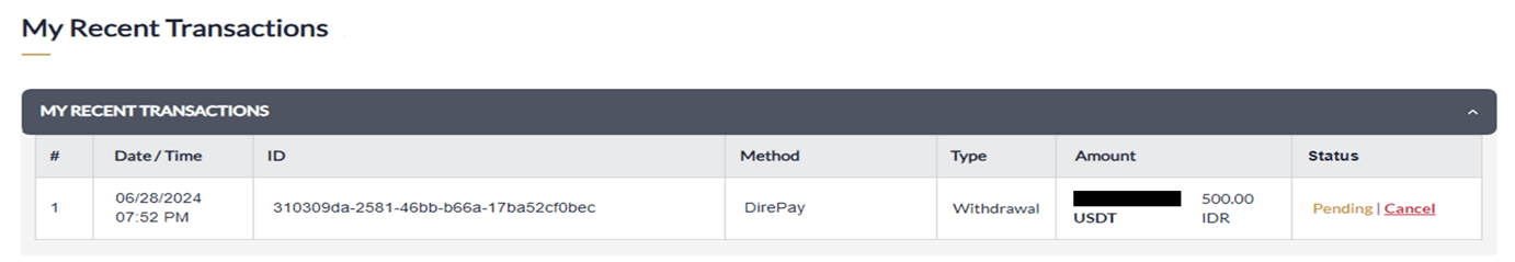 - Find your latest withdrawal record in "MY RECENT TRANSACTIONS".